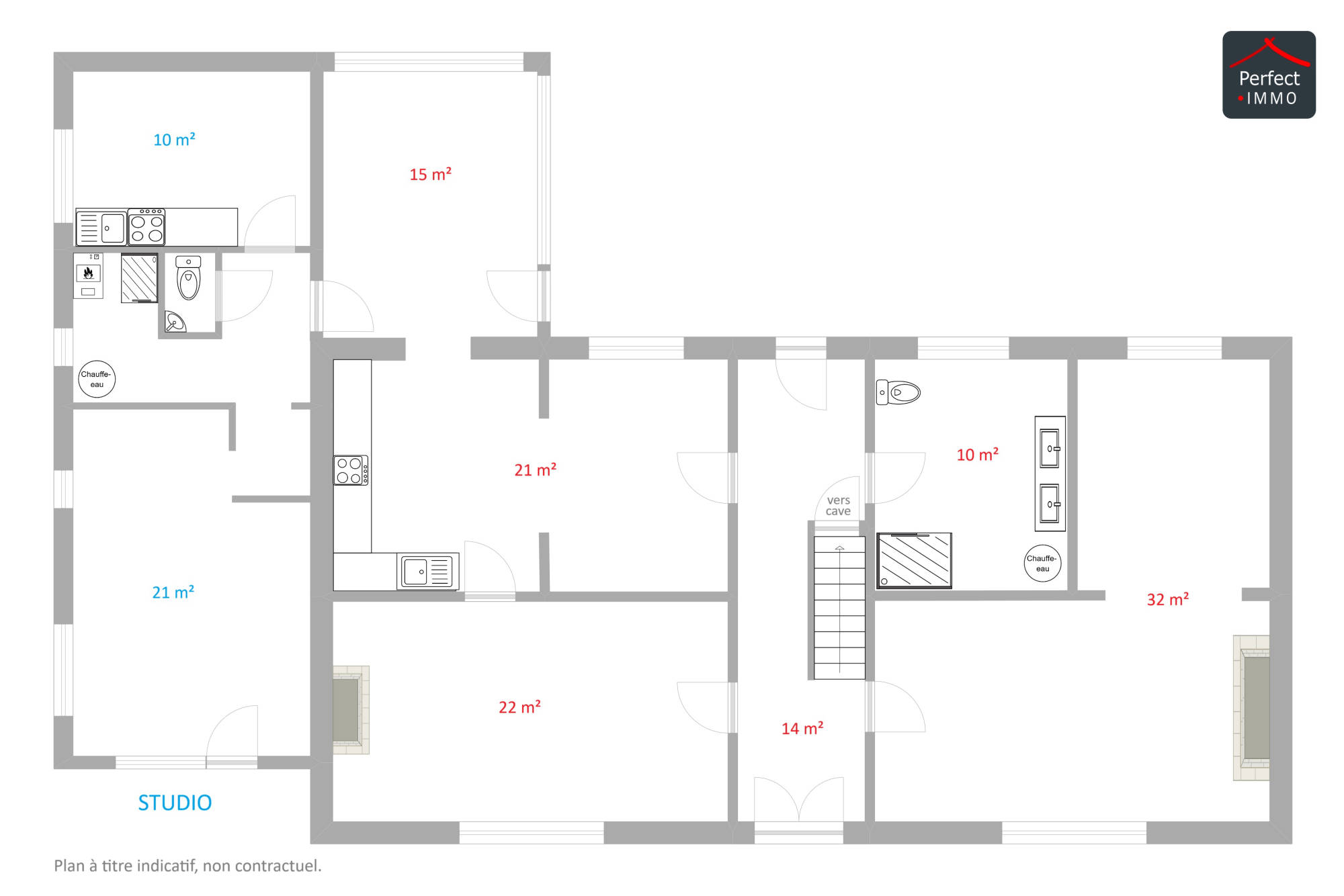 Elle vous offre 236 m² habitables dont un studio de 40 m², un grand salon/bar de 32 m², une salle à manger de 22 m² et un total de 4 grandes chambres.