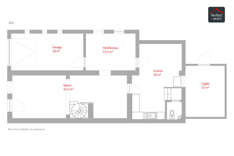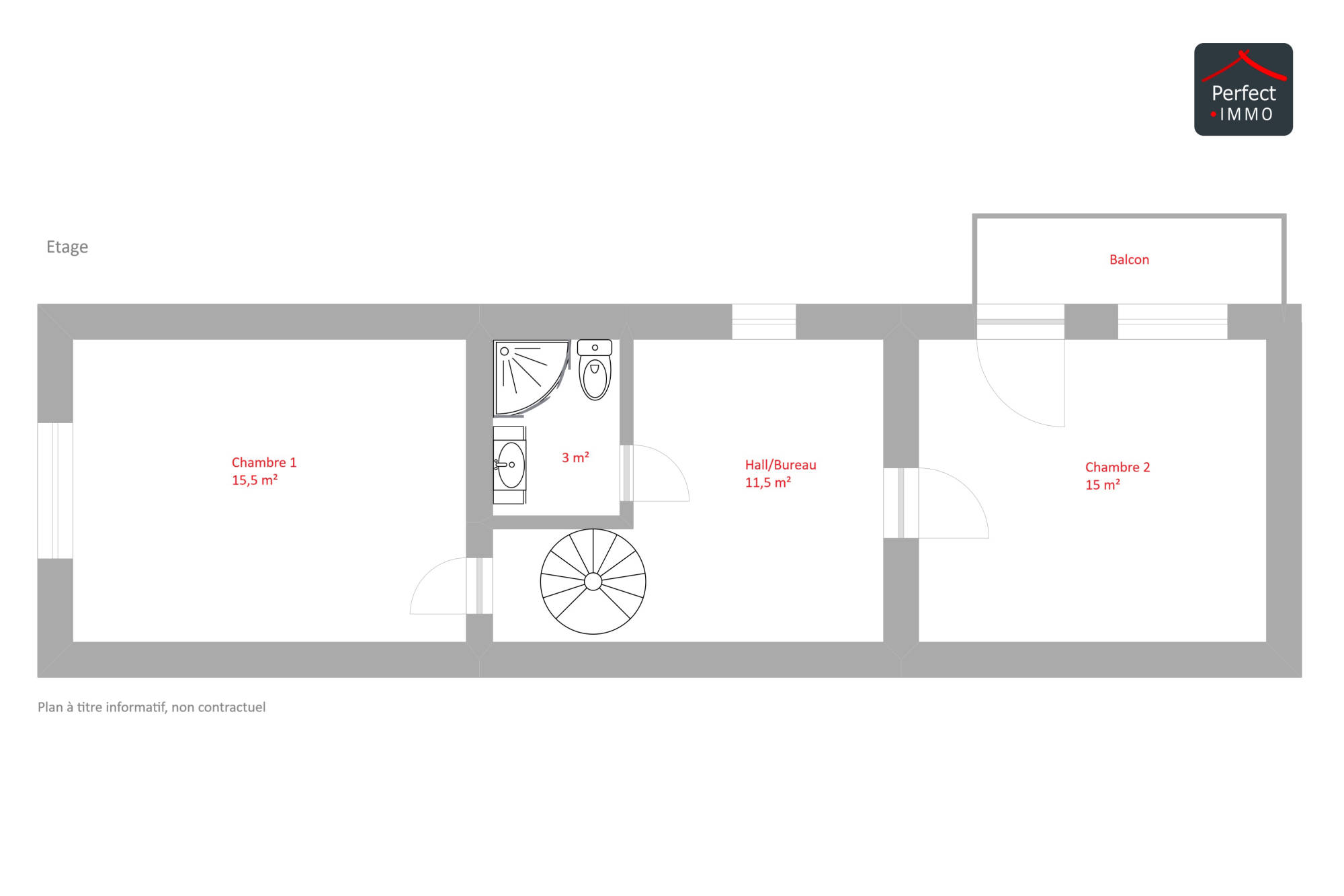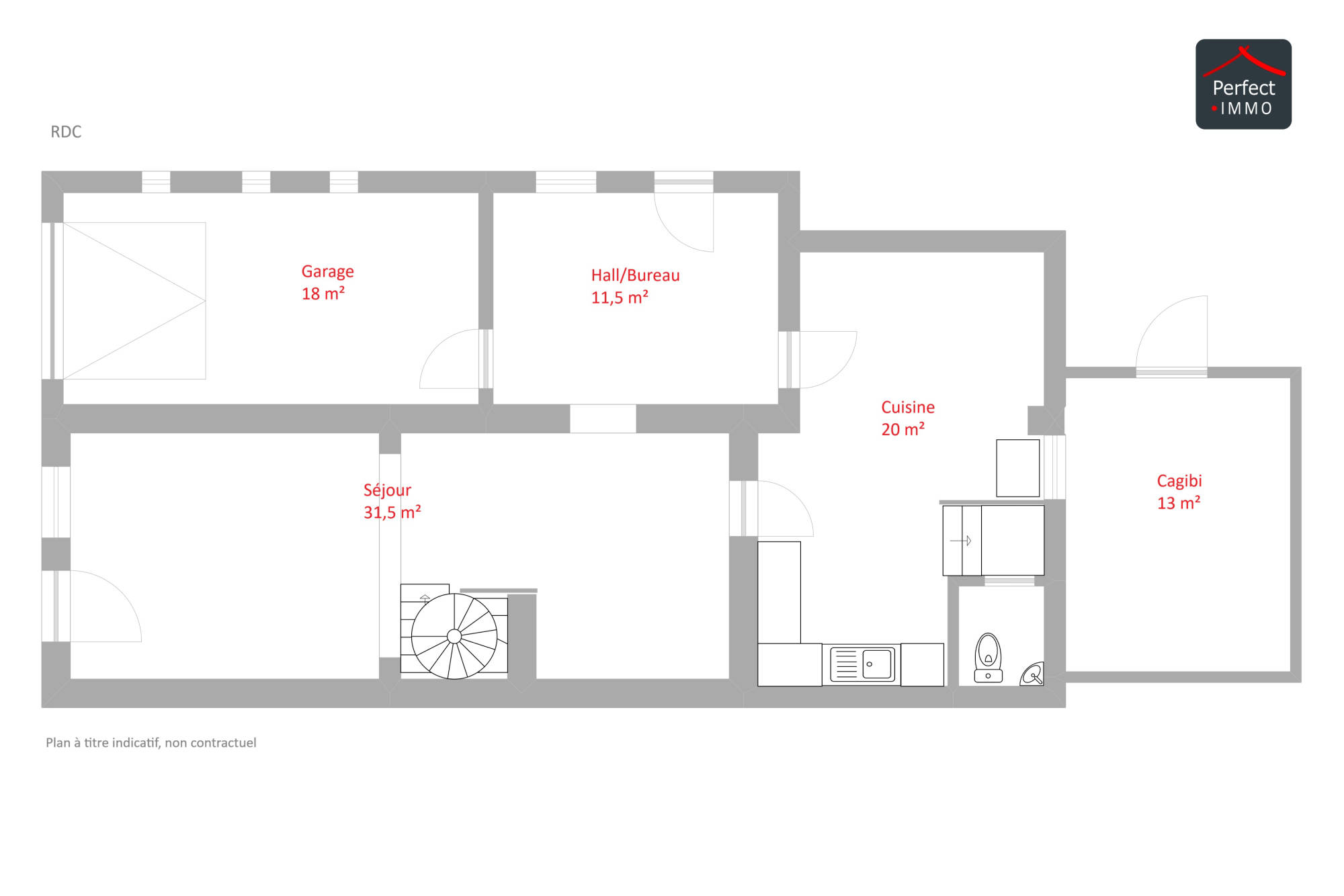 | - Hall / Bureau : 11 m² - Séjour : 31,5 m² - Cuisine : 20 m² - Salle de douche + WC : 1,5 m² | |||