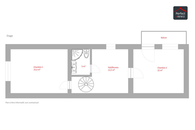 | - Hall de nuit / Bureau : 11,5 m² - Chambre 1 : 15,5 m² - Chambre 2 (+ balcon) : 15 m² - Salle de douche + wc : 3 m² Grenier (escalier escamotable) : 30 m² Cave : 20 m² Garage : 18 m² Cagibi : 13 m² |
